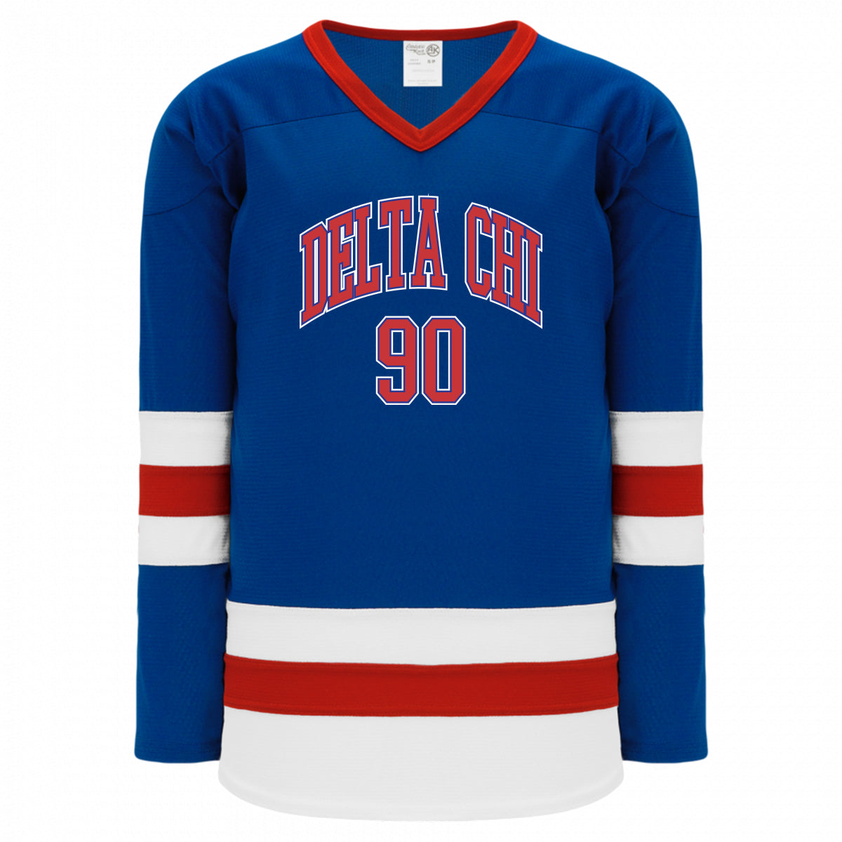 Hockey fans rejoice, there is a new Delta Chi hockey jersey on the fraternity scene! Red, white, and blue is the theme for this version of the Delta Chi hockey jersey and whether you are lacing up your skates or not, this jersey will have you looking great.